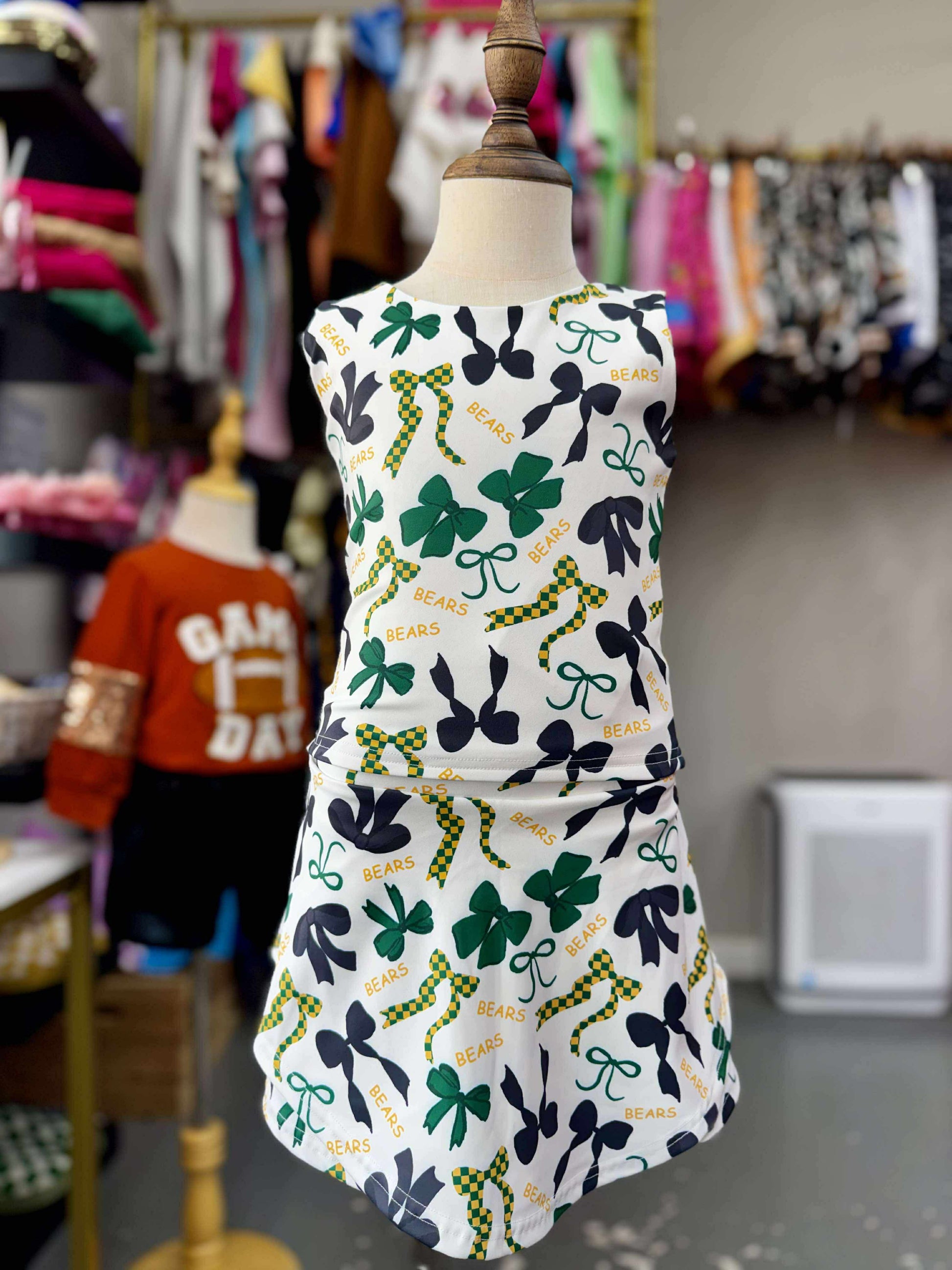 Bears and Bows Game Day Set- 77% Nylon 23% Spandex instructions for washing, hand washing only. Do Not Iron.