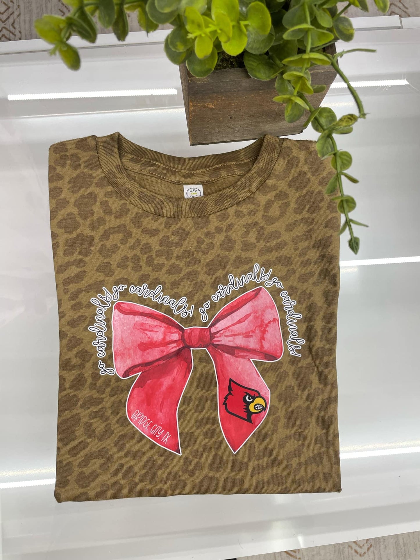 Go cardinals cursive around a large red bow cardinal head bottom right tshirt