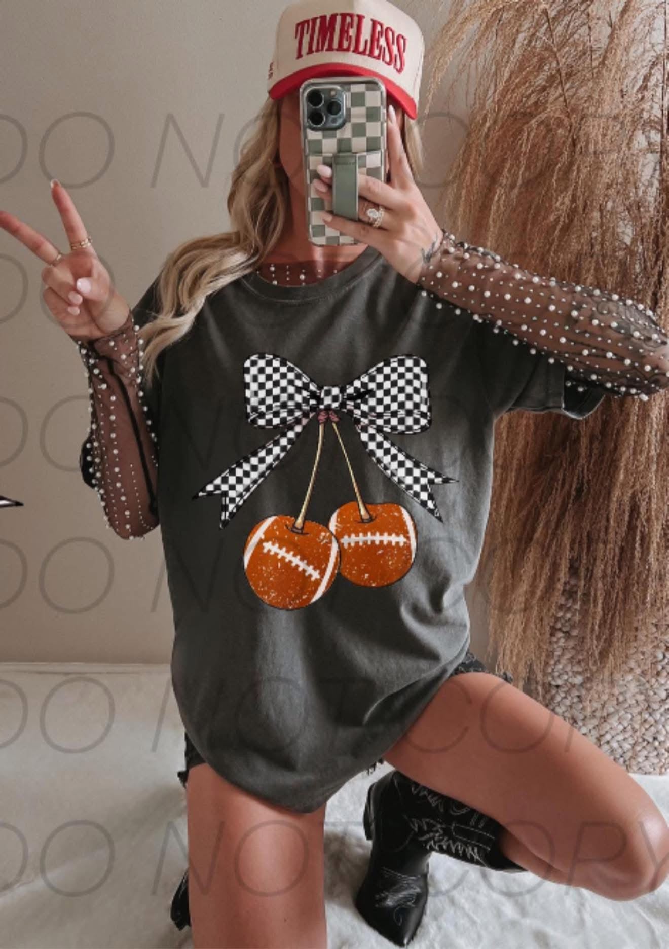 Checkered Bow with Football Cherries - T SHIRT - (Jerzee/Gildan)