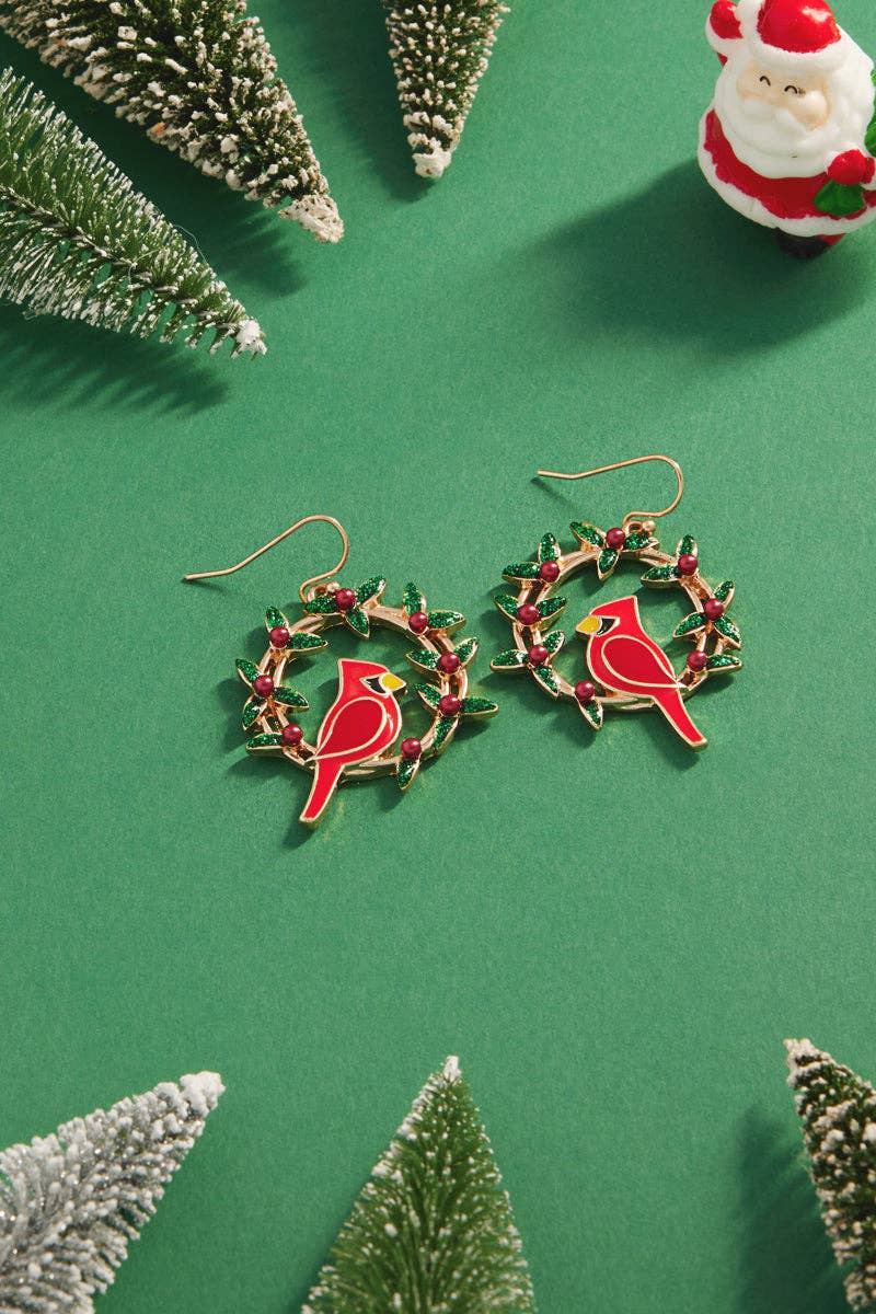 Add a festive touch to your holiday outfit with our 1.5 inch Christmas wreath shaped enamel earrings, featuring a charming cardinal and brass hook. Perfect for any occasion, these earrings are a must-have for the holiday season.