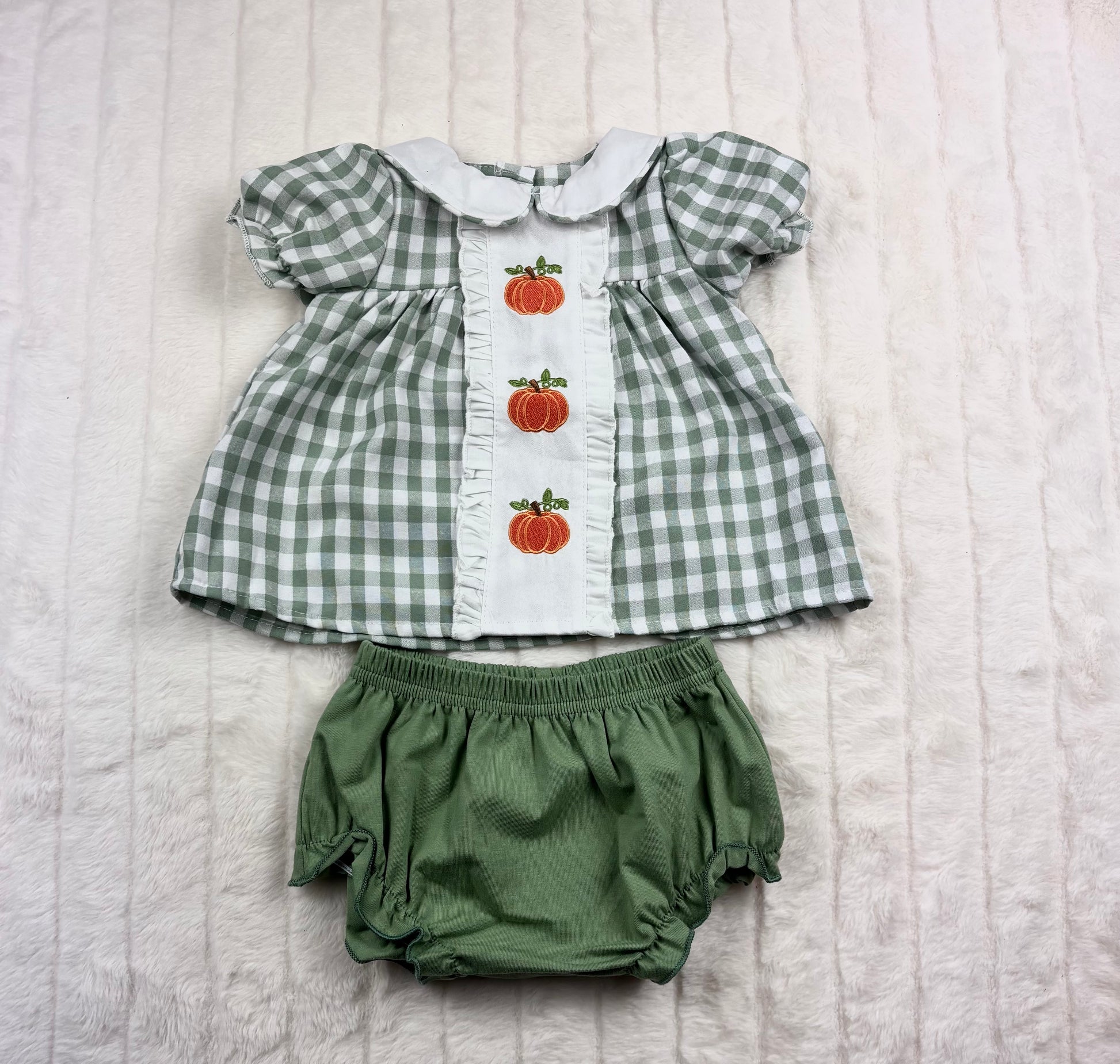Fall Halloween & Thanksgiving Pumpkin Applique Plaid Green Girls Dress- 092225 et