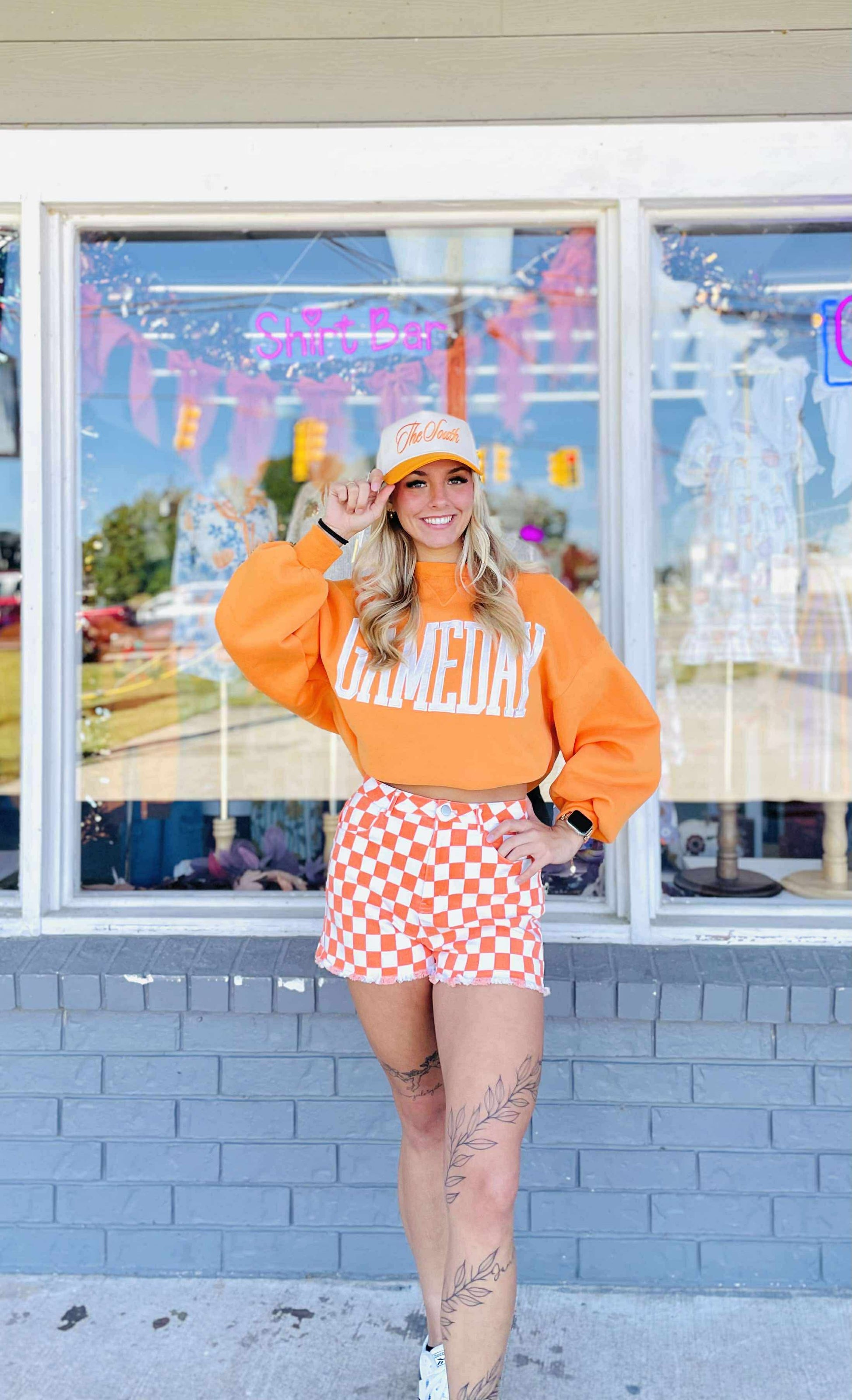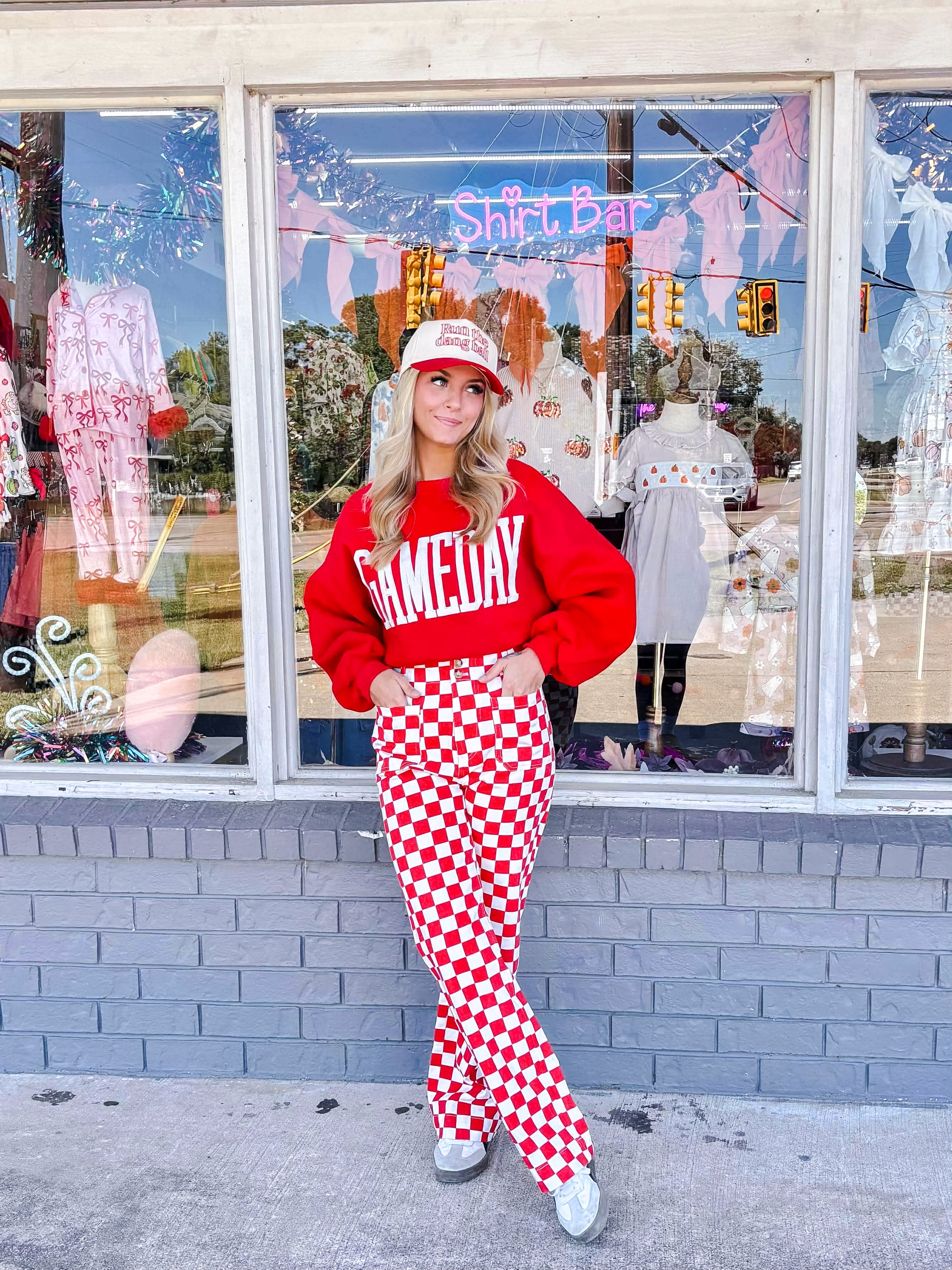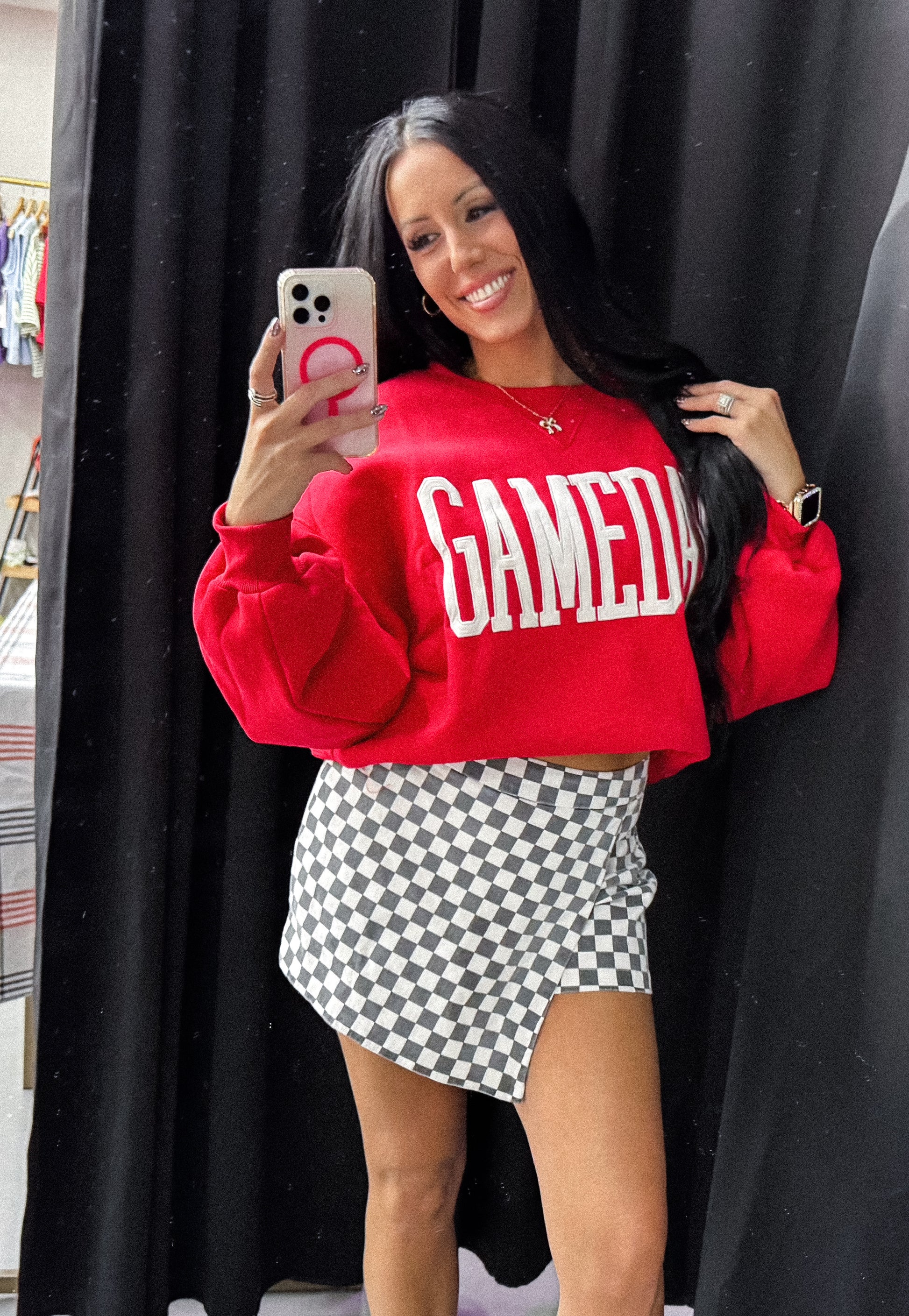 Heather gameday sweatshirt, -"Gameday" lettering, -oversized, relaxed fit, -ribbed cuffs and hem, -soft, cozy fleece interior, -crew neckline with v-stitch detail, model's height is 5' 8" and wearing a size s