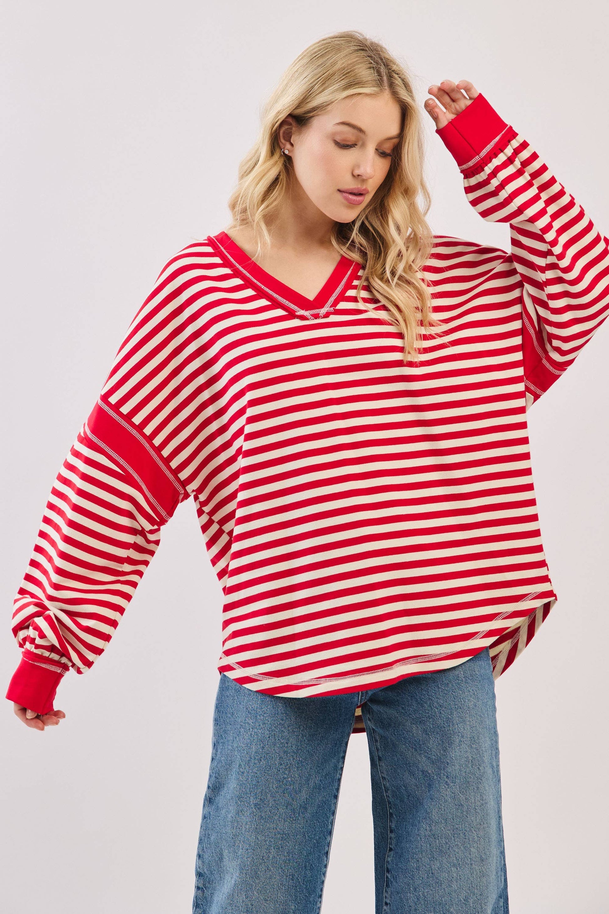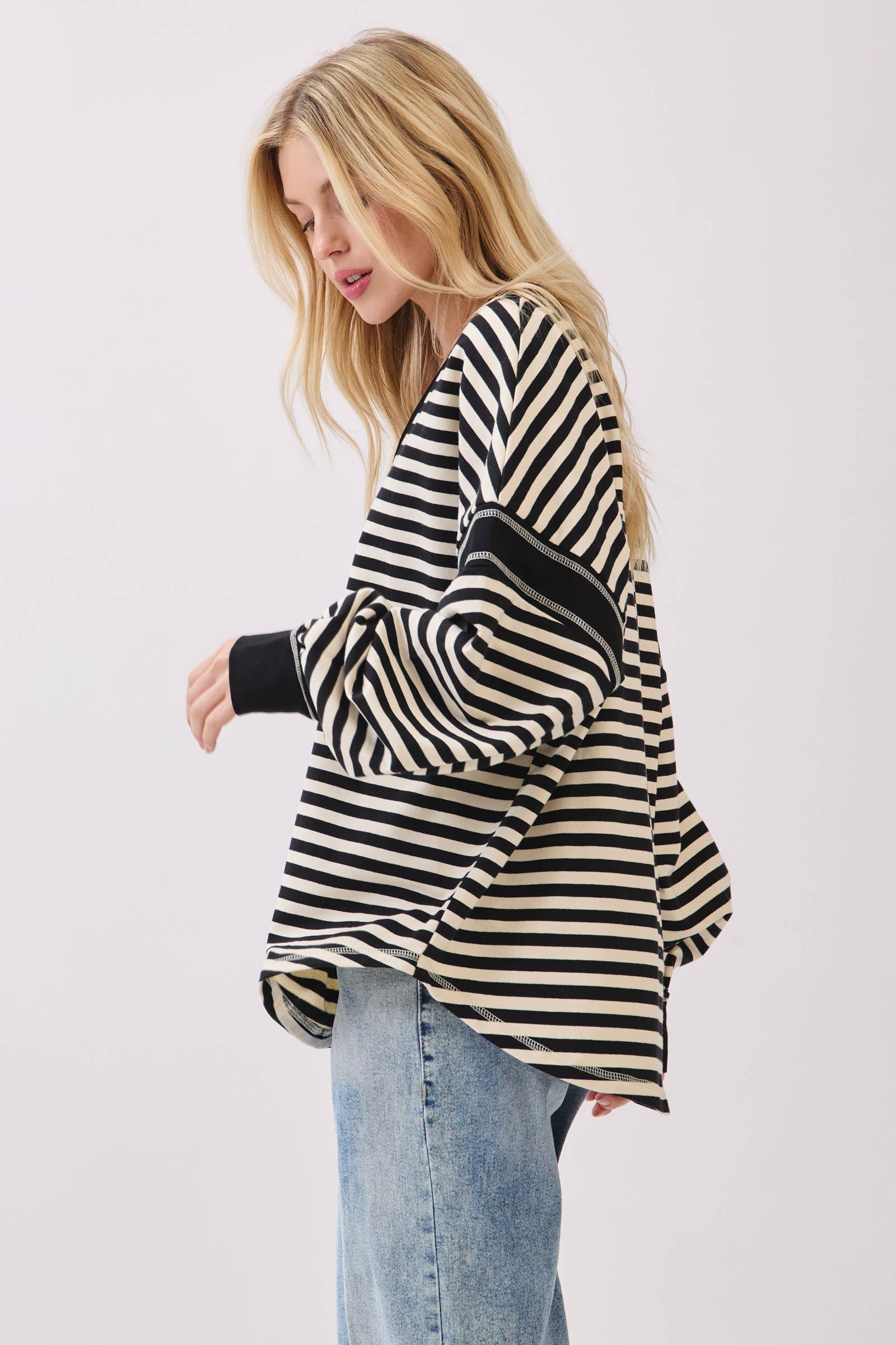 This cozy striped knit top features a flattering V-neckline and voluminous balloon sleeves for an effortlessly chic silhouette. Designed with ribbed trim details and a relaxed fit, it's perfect for layering or wearing on its own. Whether you're dressing it up or down, this versatile piece brings a pop of style to any casual outfit. Ideal for boutique collections looking to blend comfort with standout design.striped top, v-neck sweater, balloon sleeve top, knit pullover, casual boutique top, relaxed fit shirt, comfy knitwear, wholesale fashion, everyday wear, trendy top, boutique clothing,
